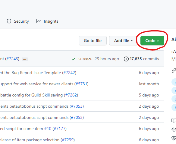 1. 다운로드 링크 (rAthena Github 페이지) 로 들어가서 'Code' 버튼 클릭