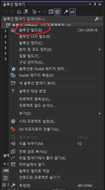 솔루션 'rAthena' 항목을 마우스 오른쪽으로 누르면