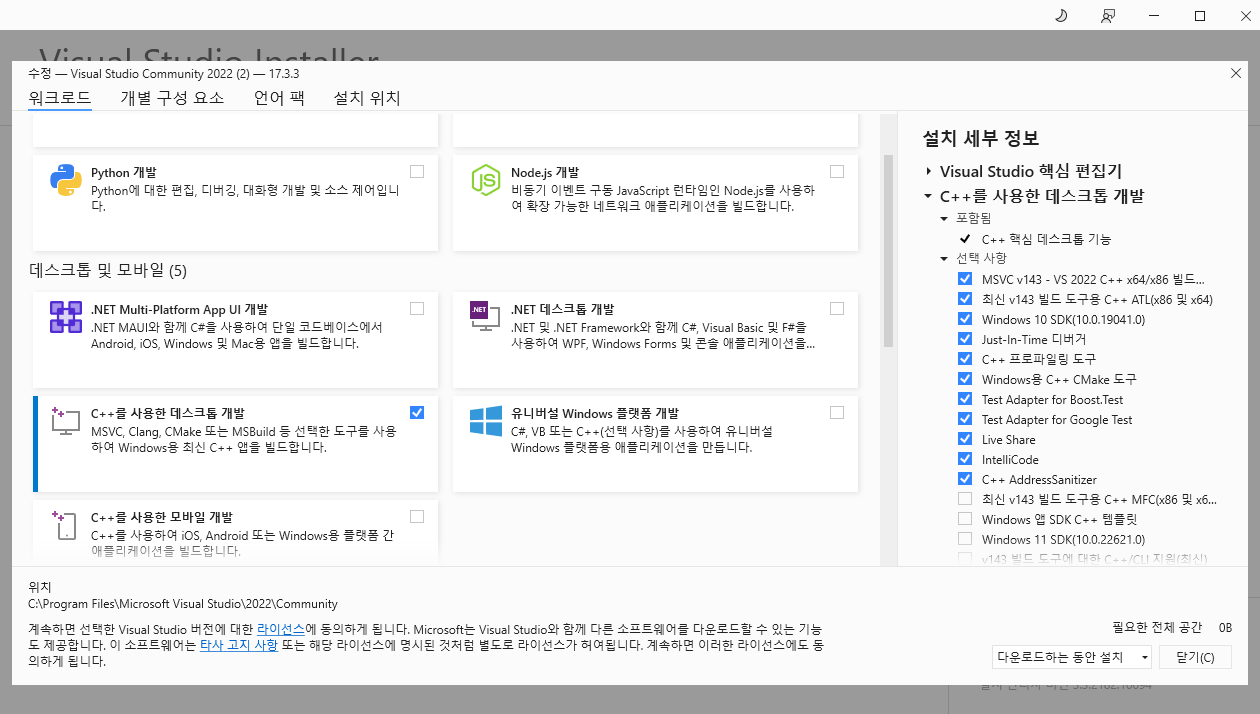 여기서 C++를 사용한 데스크톱 개발을 선택해주도록 하자.