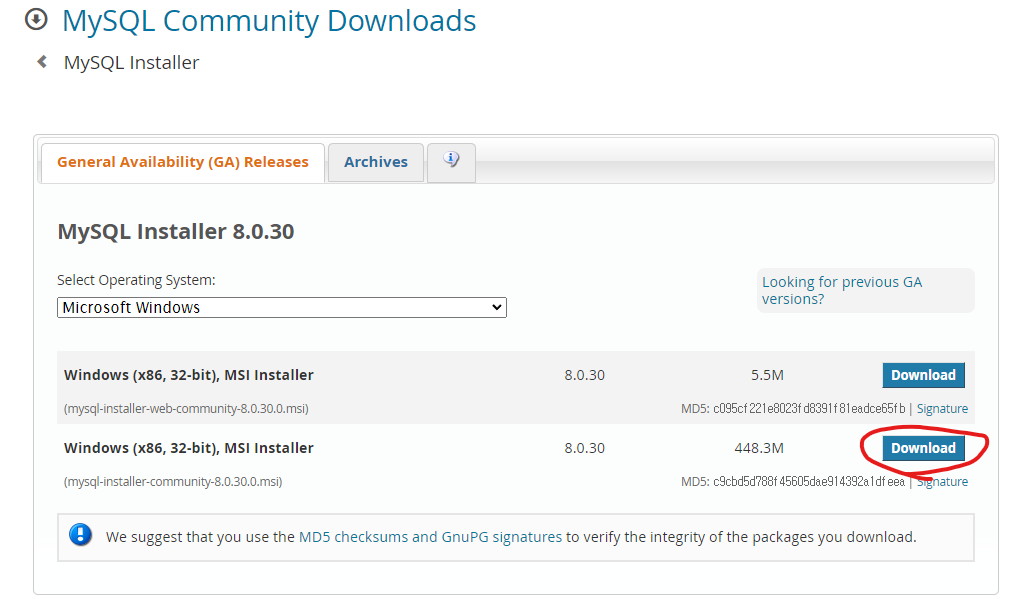 MySQL Installer for Windows 를 눌러준다. (붉은색 네모친 부분)