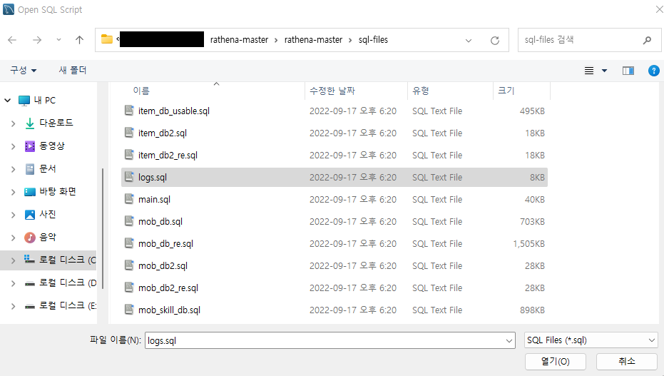 그러면 SQL 파일을 선택하는 창이나오는데,