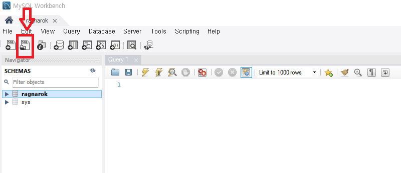 그 다음, 위 이미지에 붉은색 박스가 쳐진 'SQL 열기' 아이콘을 누른다.