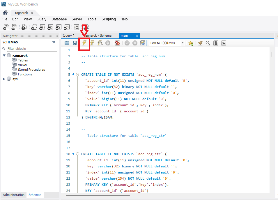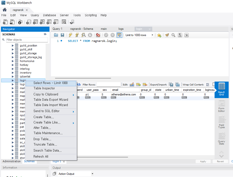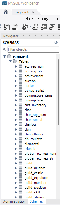 오른쪽 Navigator 창의 Ragnarok > Tables 에서