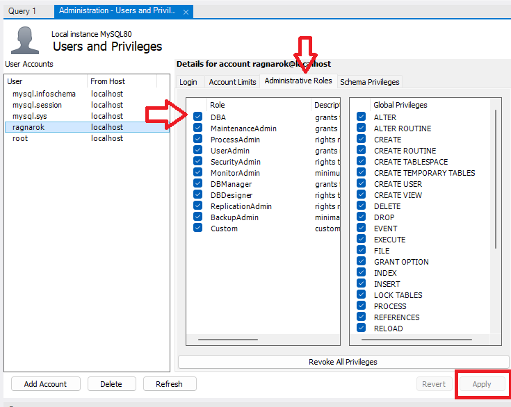 (해당 과정은 ragnarok 라는 방금 새로 만든 유저 계정에 MySQL 권한을 부여하는 과정이다.)