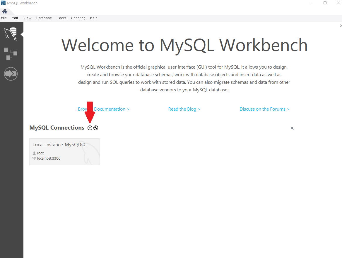 여기서 MySQL Connections 옆 + 아이콘을 눌러준다.