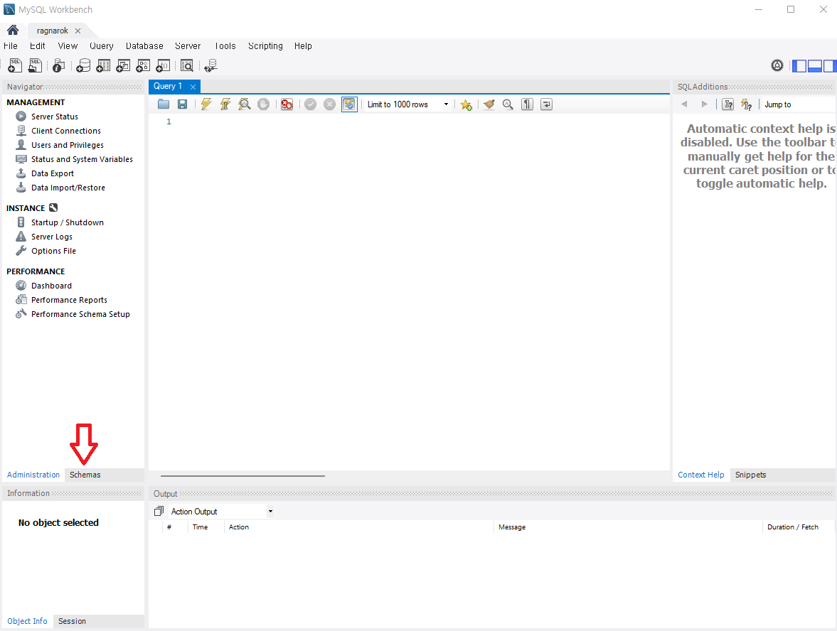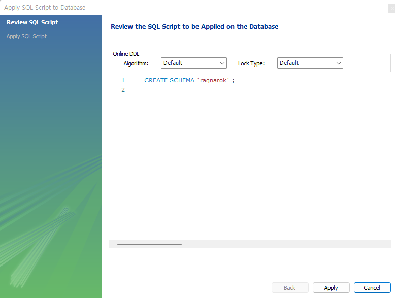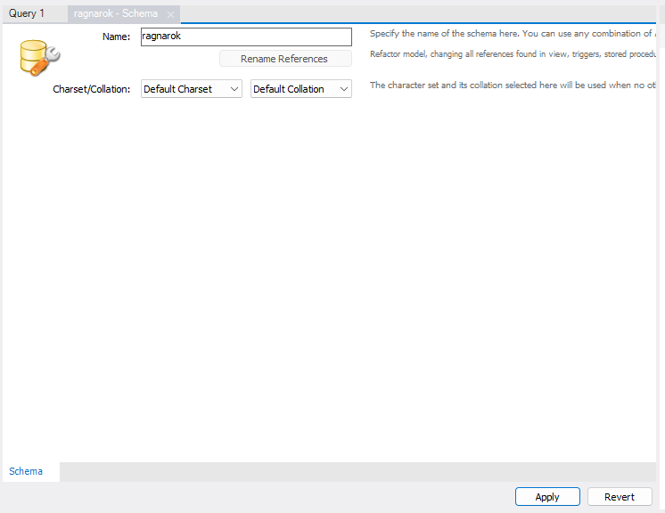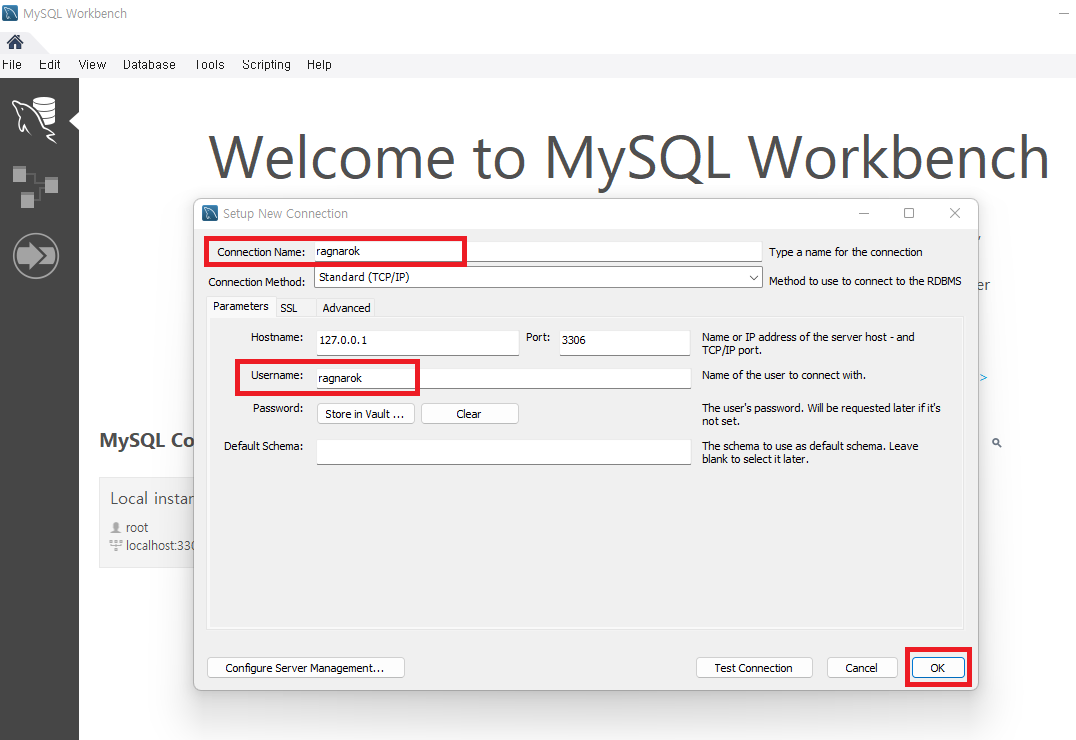 새로 만든 연결에서, 스키마 이름또한 ragnarok 로 설정했다.