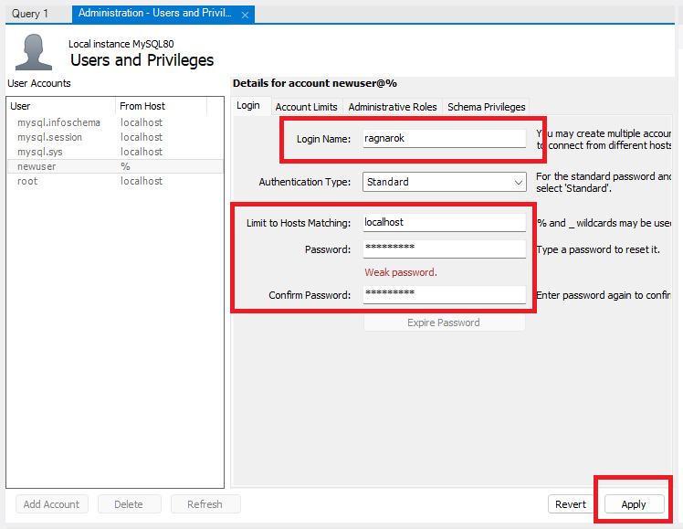 MySQL 에서 새 유저계정 추가를 할 때, id 또는 pw를 ragnarok 가 아닌 다른걸로 설정했다면