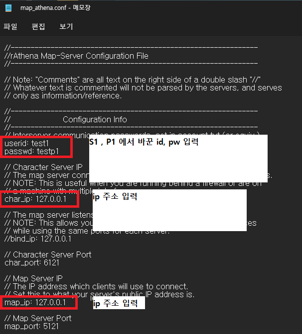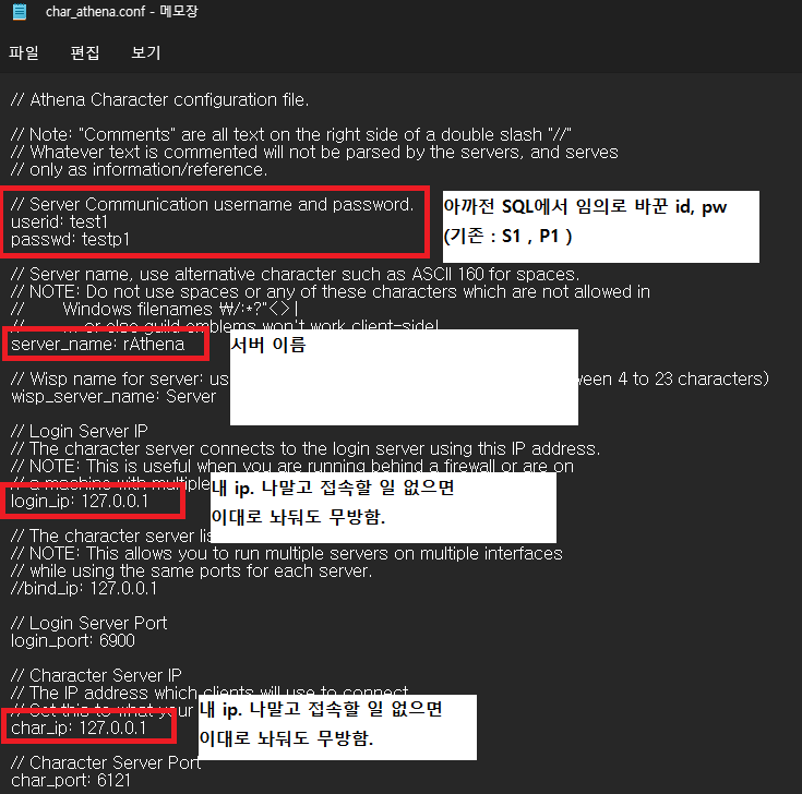char_athena.conf 파일에서 변경해 줄 부분은 위와같이 4개 이다.